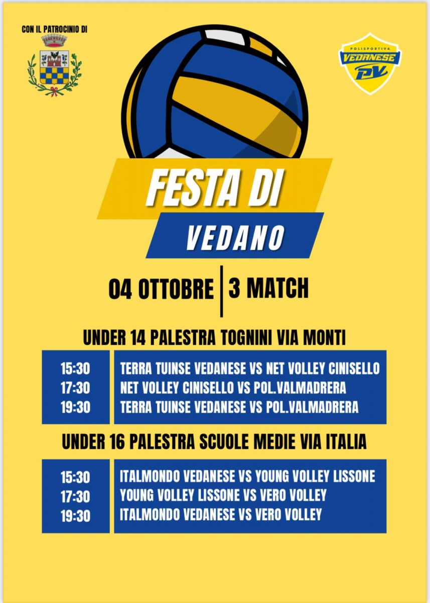 In occasione della festa di Vedano al Lambro, sabato 04 ottobre 2025 presso la palestra di via Tognini e la palestra di Via Italia, la Polisportiva ha organizzato un triangolare di Volley per la categoria under 14 e under 16.